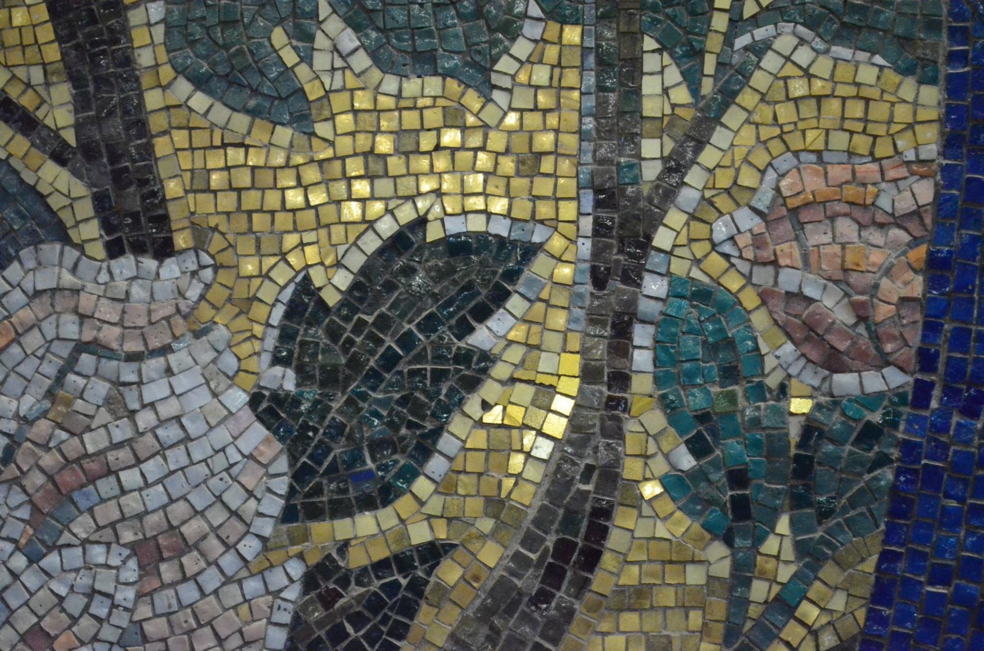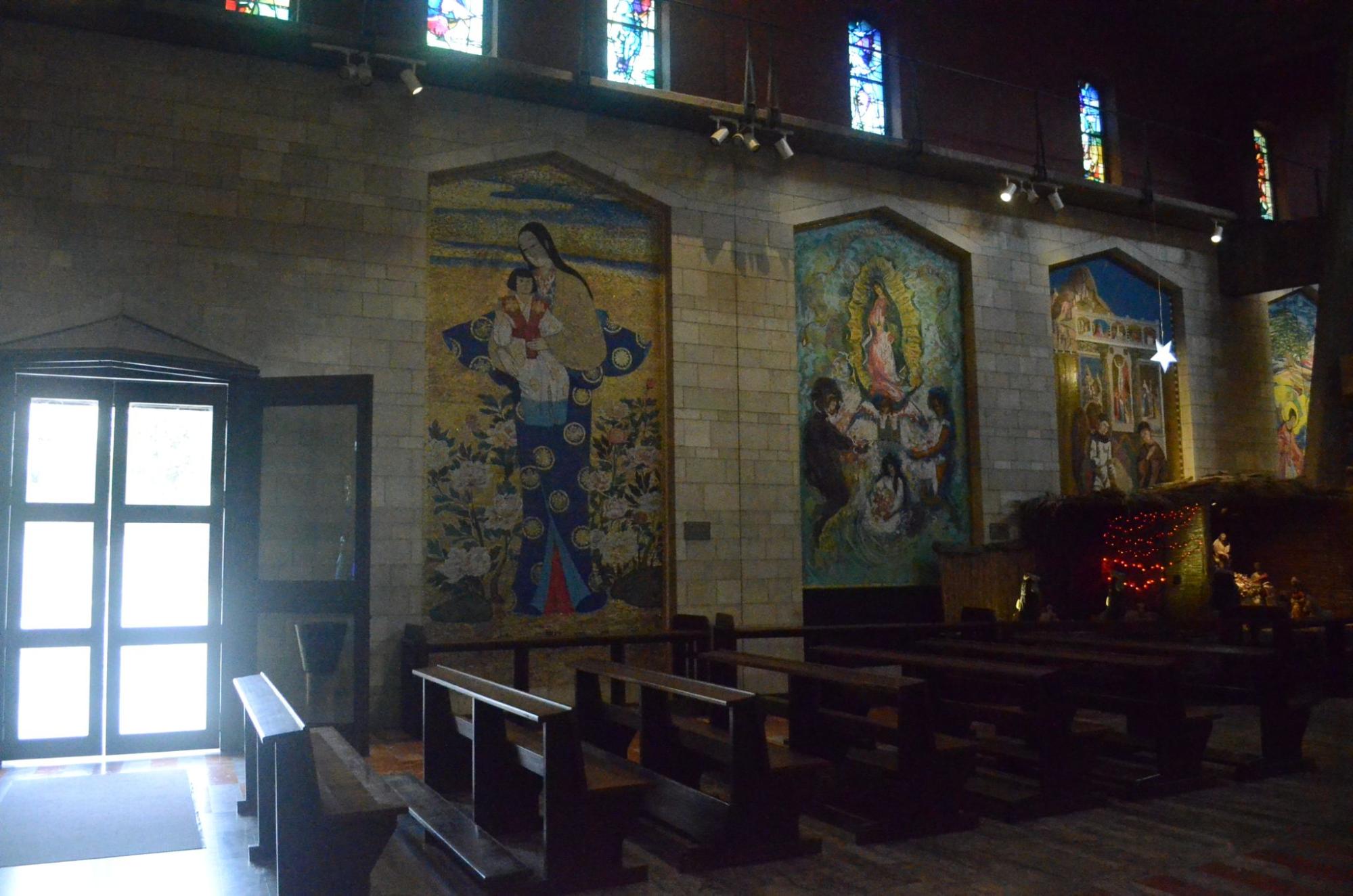 受胎告知教会はというと、キリストよりもマリアを重んじた施設になっていて、マリアを描いたアート作品が複数展示されています。なかでも有名なのが、日本人アーティストの長谷川路可(はせがわろか)による『華の聖母子像(はなのせいぼしぞう)』。
