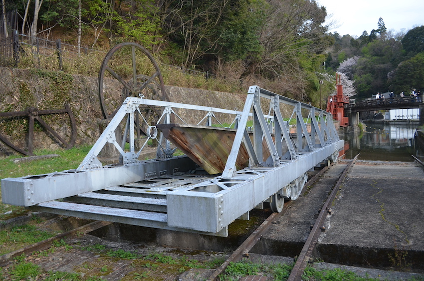 坂を登ると、当時使われていた台車の復元がありました。台車はもともと船を乗せていたそうで、船もいっしょに展示されていました。