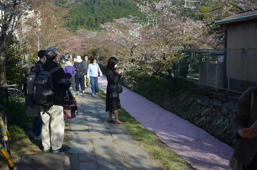 春になると、哲学の道の横にある運河の水面が桜の花びらで埋め尽くされるため、文字通りピンクの川になります。