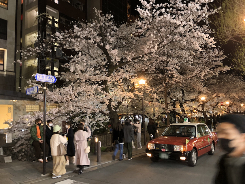 木屋町通りはというと、すでに楽しい気分が充満している道についでに桜が咲いた。という雰囲気。遊んでいる時にたまたま通りかかった道に桜が咲いていたらラッキーな気分になりますよね。