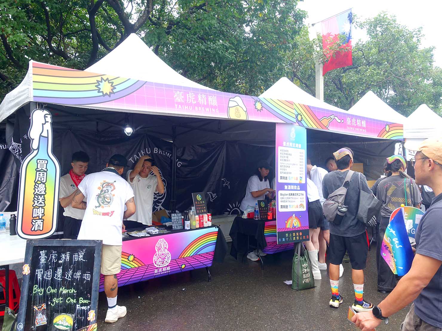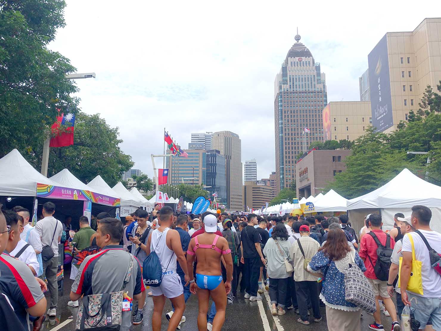 パレードの出発地点兼会場となったのは、台北101のお膝元にある台北市政府前。車両通行止めの歩行者天国となった道路には、LGBT関連団体や協賛企業、クリエイターなどの出展ブースがずらりと並びます。