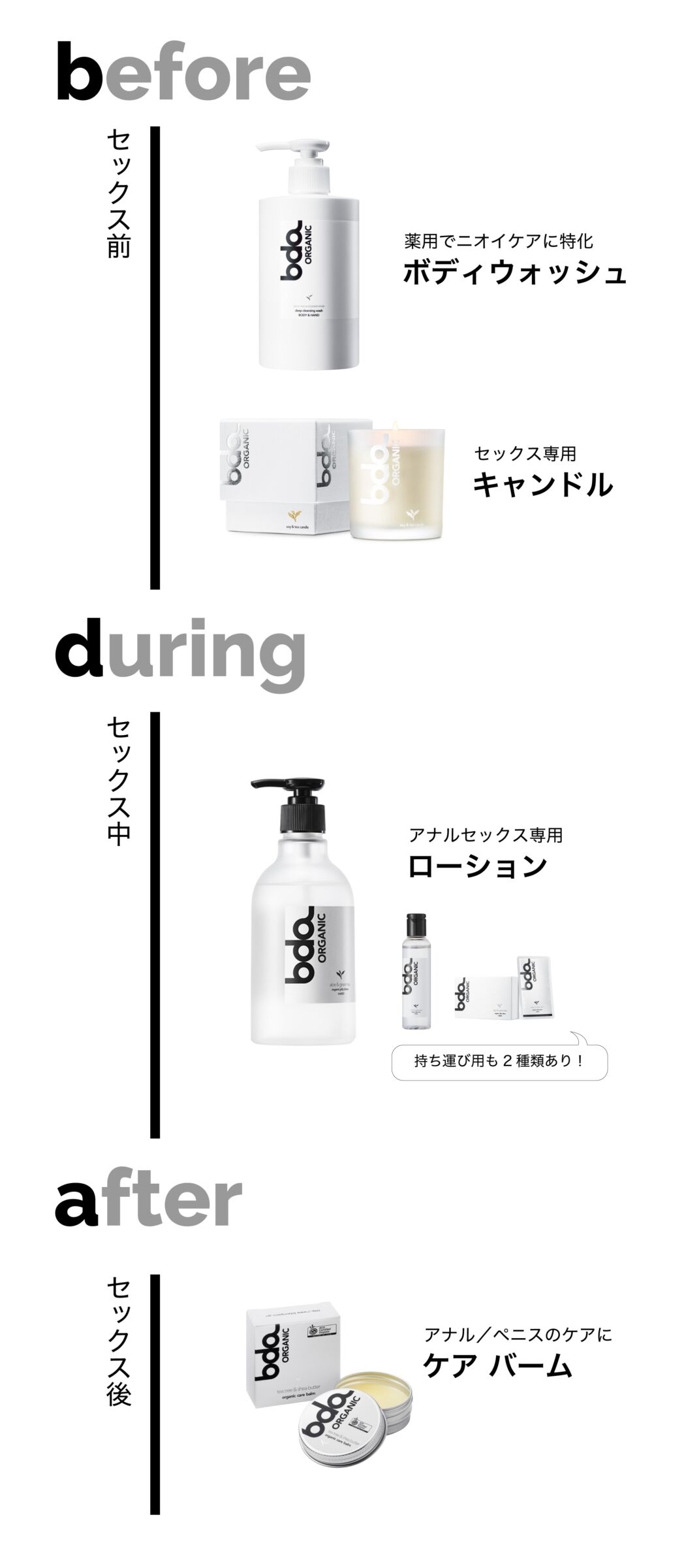 そして、さらにセックスの満足度を高めたい人にオススメしたいのが、bda ORGANIC(ビーディーエー オーガニック)の各種アイテムだ。